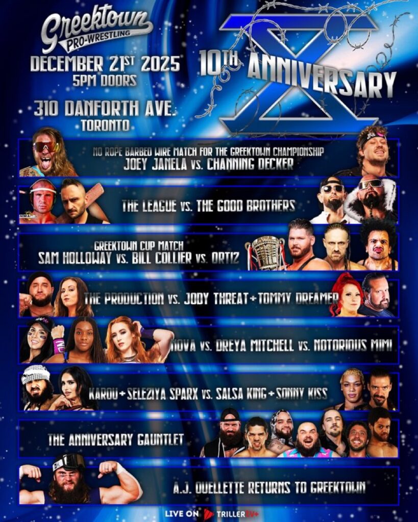 On Sunday, December 21st, Greektown Pro-Wrestling closes out the year with their must-see “10th Anniversary Show!” Some of the best talent in Independent Wrestling will be together all under one roof in Toronto!