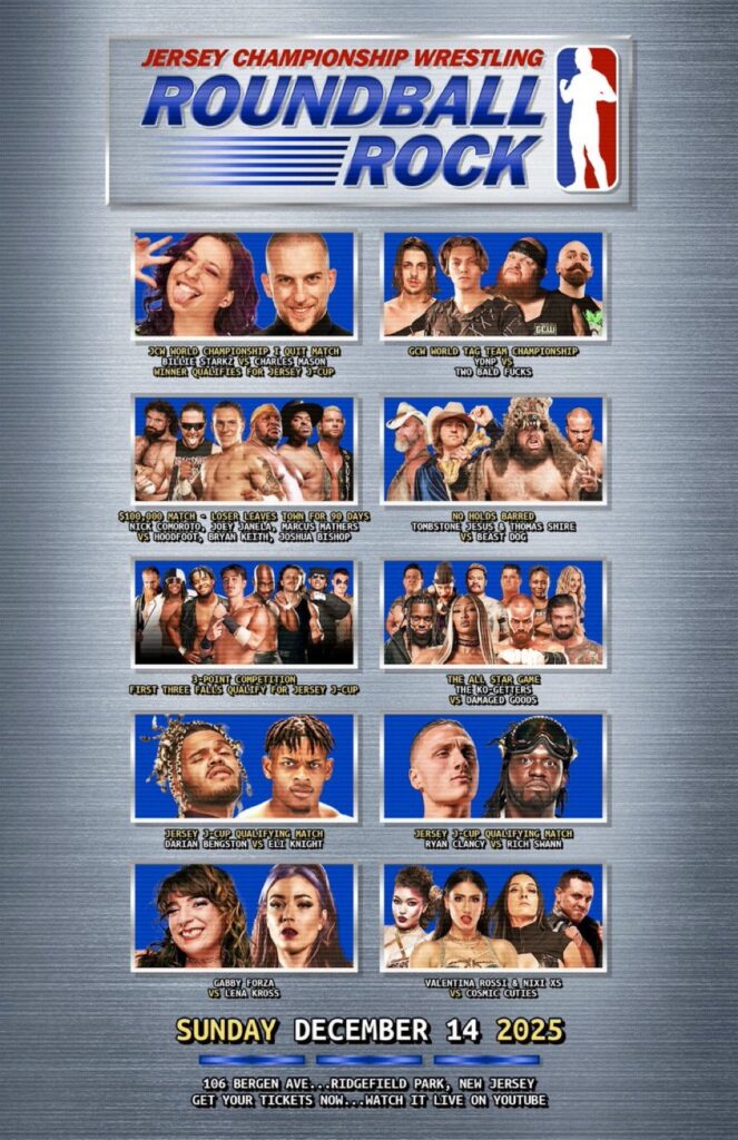 On Sunday, December 14th, JCW closes out the year by returning to The Mecca in Ridgefield Park, NJ, for their latest event, “Roundball Rock,” streaming on GCW/JCW’s YouTube channel, beginning at 5 PM EST!
